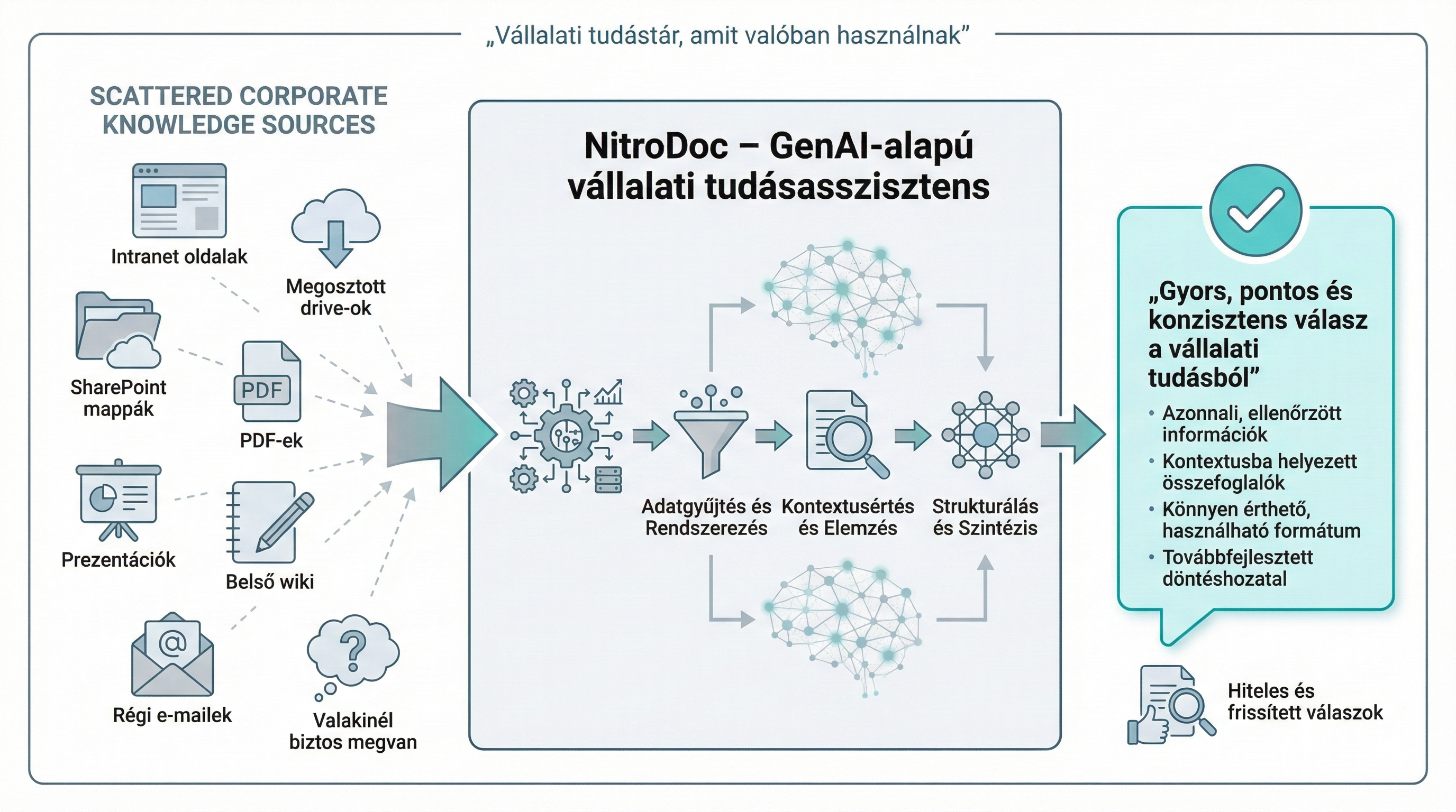 A legtöbb szervezetben a tudás nem hiányzik, hanem sajnos általában szétszórt és nehezen hozzáférhető. Intranet oldalak, SharePoint mappák, megosztott drive-ok, PDF-ek, prezentációk, belső wikik, régi e-mailek és „valakinél biztos megvan” típusú információk élnek egymás mellett. A NitroDoc fejlesztésekor ezt a valóságot vettük alapul, hiszen mi is ezzel találkozunk a piacon, ezért ezt a helyzetet tesszük kezelhetővé: a vállalati dokumentumokat, szabályzatokat és tartalmakat olyan formába rendezi, amelyből gyorsan előhívható a releváns rész, majd ezt a GenAI segítségével közérthető válasszá alakítja.